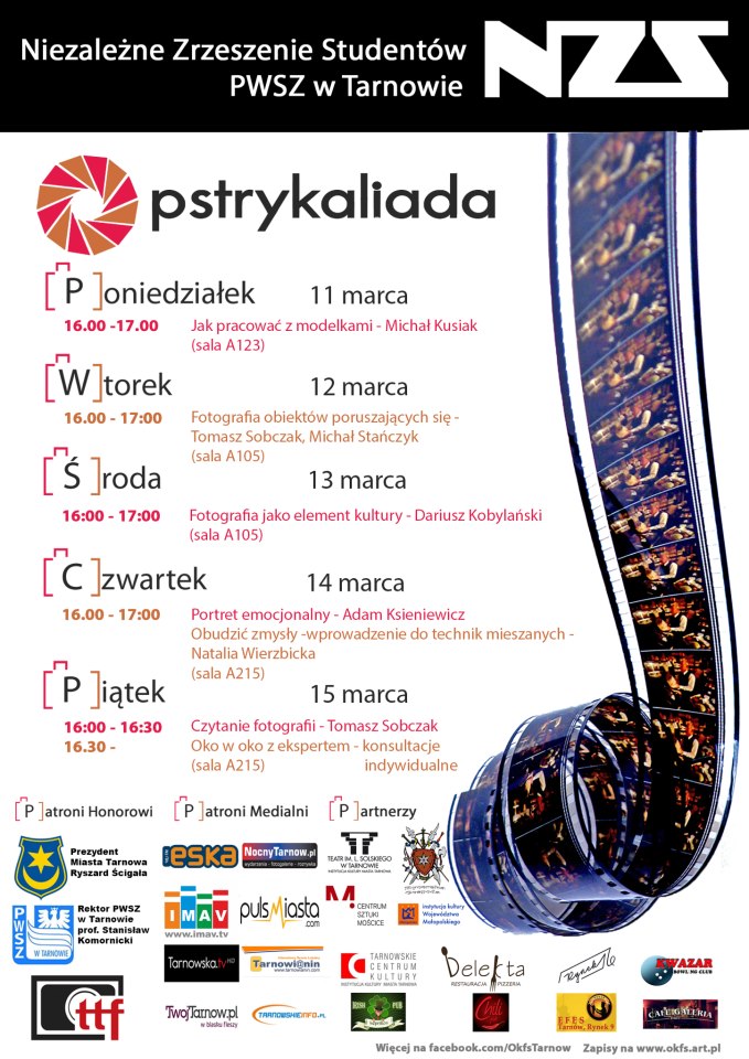 Serdecznie zapraszamy do udziału w tarnowskiej „pstrykaliadzie”. A studentów do udziału w Ogólnopolskim Konkursie Fotografii Studenckiej. Są atrakcje, nagrody i ciekawe wydarzenia. Więcej informacji na plakacie oraz na stronie ->www.okfs.art.pl<-